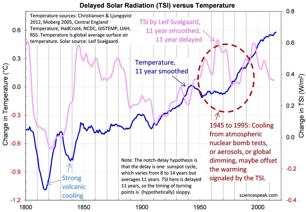 This suggests a delay of ~11 years from changes in TSI to corresponding changes in surface temperatures. Indeed, without a delay it is difficult to see how TSI could be signaling the major influence on the surface temperature. (The Lockwood and Froehlich paper is often held by the establishment as evidence for the lack of solar influence on global temperature.)